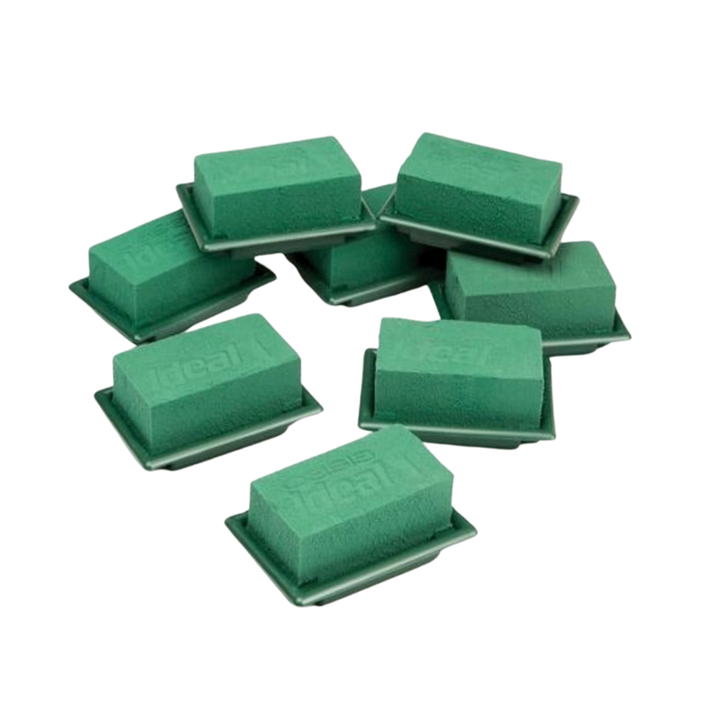 A pre cut rectangular piece of Oasis wet foam inserted into a plastic base, used for fresh flowers, allowing them to stay fresh much longer