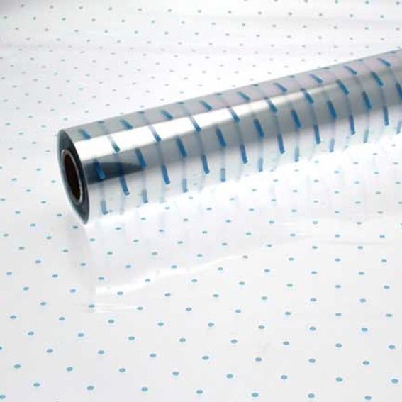 A roll of baby blue dots cellophane.