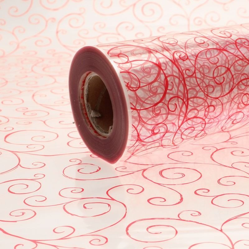 A clear cellophane roll with Red Scrolls on.