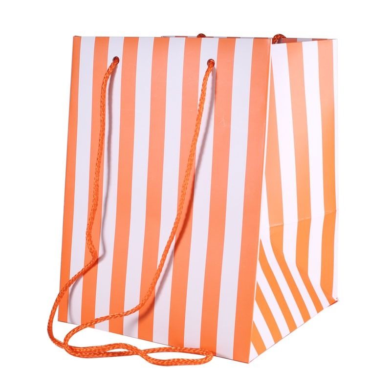 A traditional orange candy stripe hand tie bag with rope handles