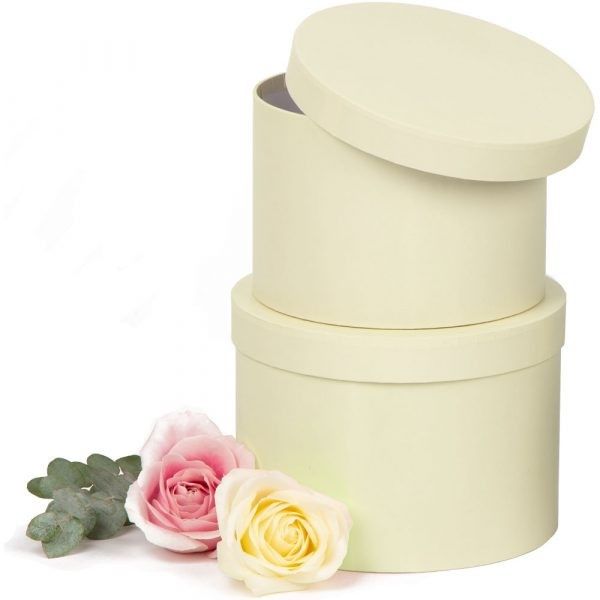 This elegant set includes one large and one medium box, both featuring a soft cream satin finish lamination that is water resistant for enhanced durability. The secure lids make these boxes perfect for organising accessories or for creating a sophisticated presentation for gifts or floral arrangements.