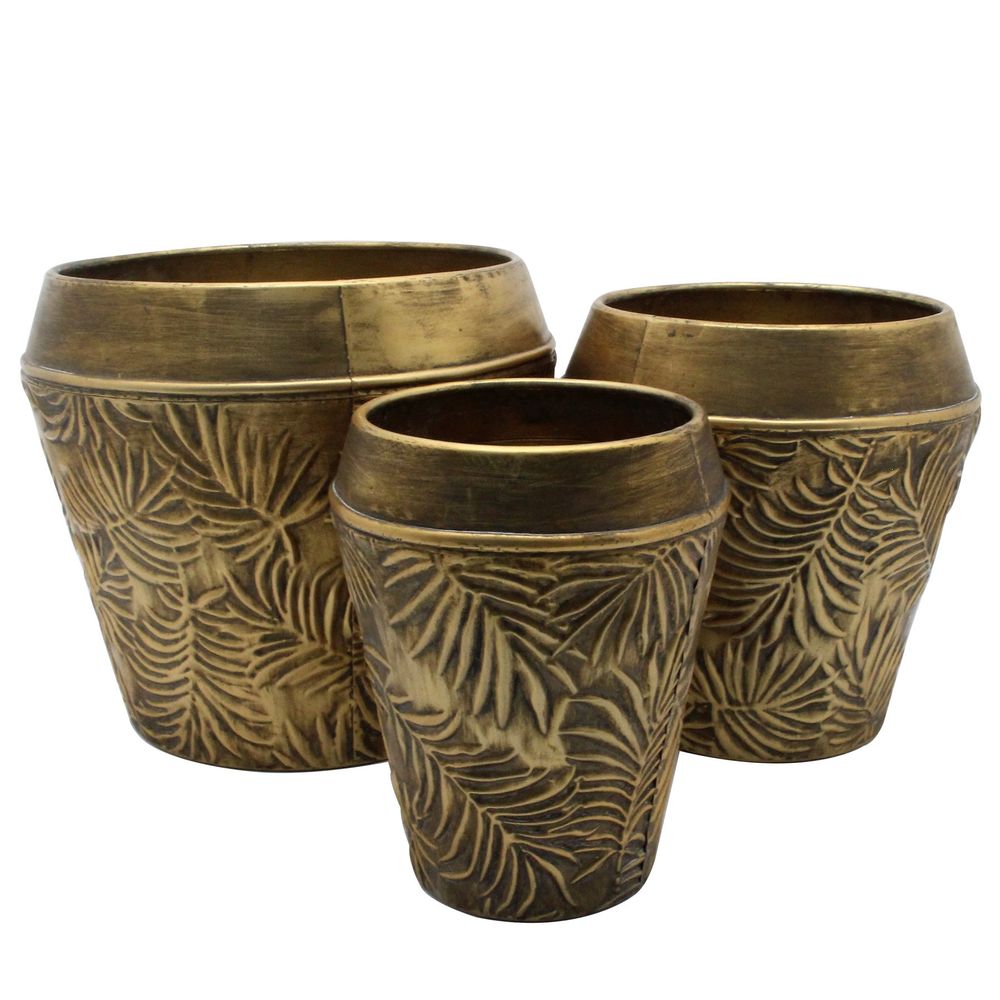 A set of three tropical metal vases with a gold style, in three different sizes - small, medium and large. This are so on trend and look stunning with flowers or plants planted inside or other special arrangements.