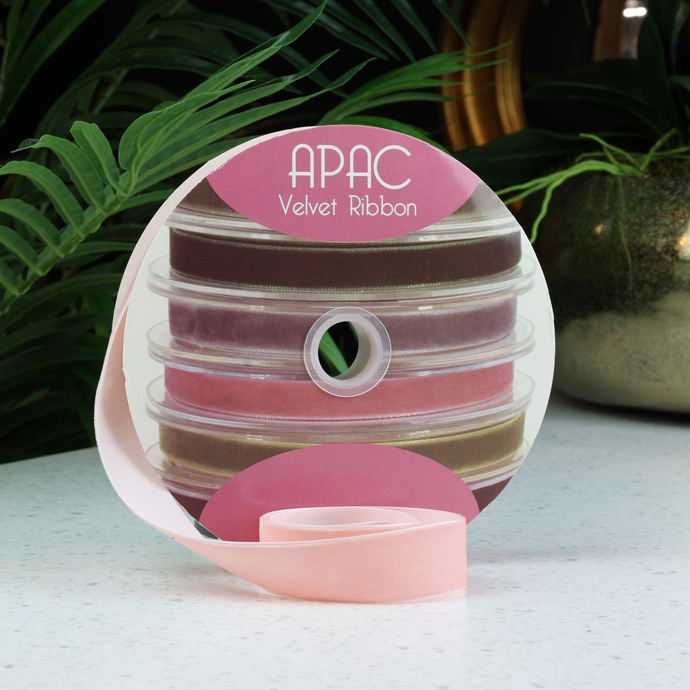 A beautiful velvet ribbon, a soft weave with a mat finish made from nylon or polyester. This versatile product is perfect for trimming gifts, church pews or bouquets.