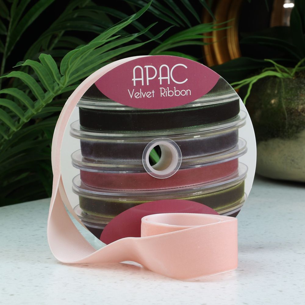 A beautiful velvet ribbon, a soft weave with a mat finish made from nylon or polyester. This versatile product is perfect for trimming gifts, church pews or bouquets.