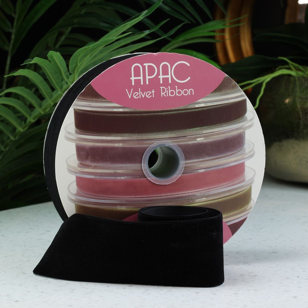 A beautiful velvet ribbon, a soft weave with a mat finish made from nylon or polyester. This versatile product is perfect for trimming gifts, church pews or bouquets.