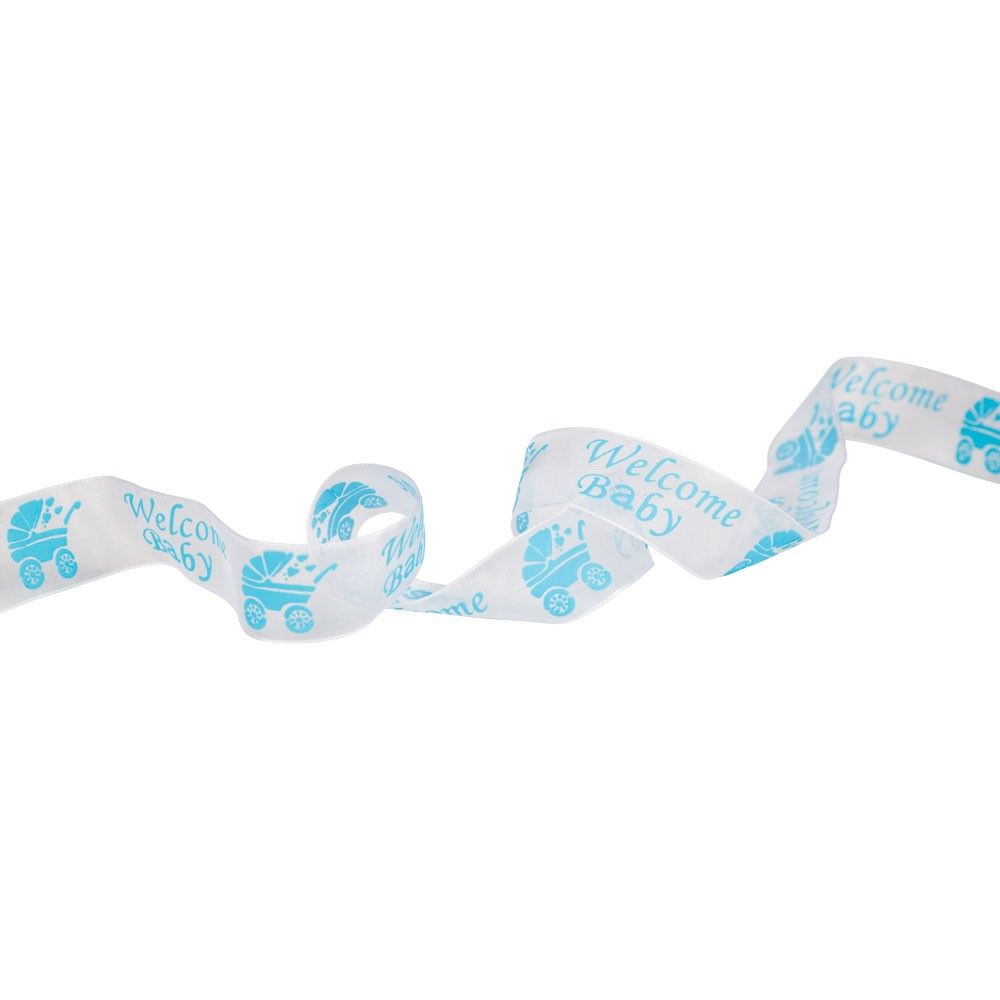 This soft, sheer ribbon features a continuous "Welcome Baby" text and a charming pram design in blue, perfect for baby showers, gift wrapping, or creating sweet, personalised keepsakes for the new arrival.
