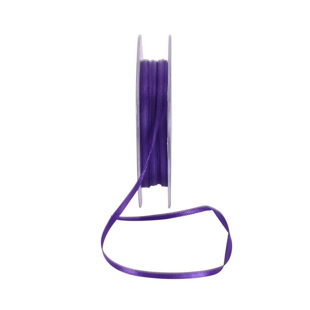 A roll of 3mm dark purple satin ribbon, perfect trim for tying around favour boxes, napkins, stationery, gifts or flowers.