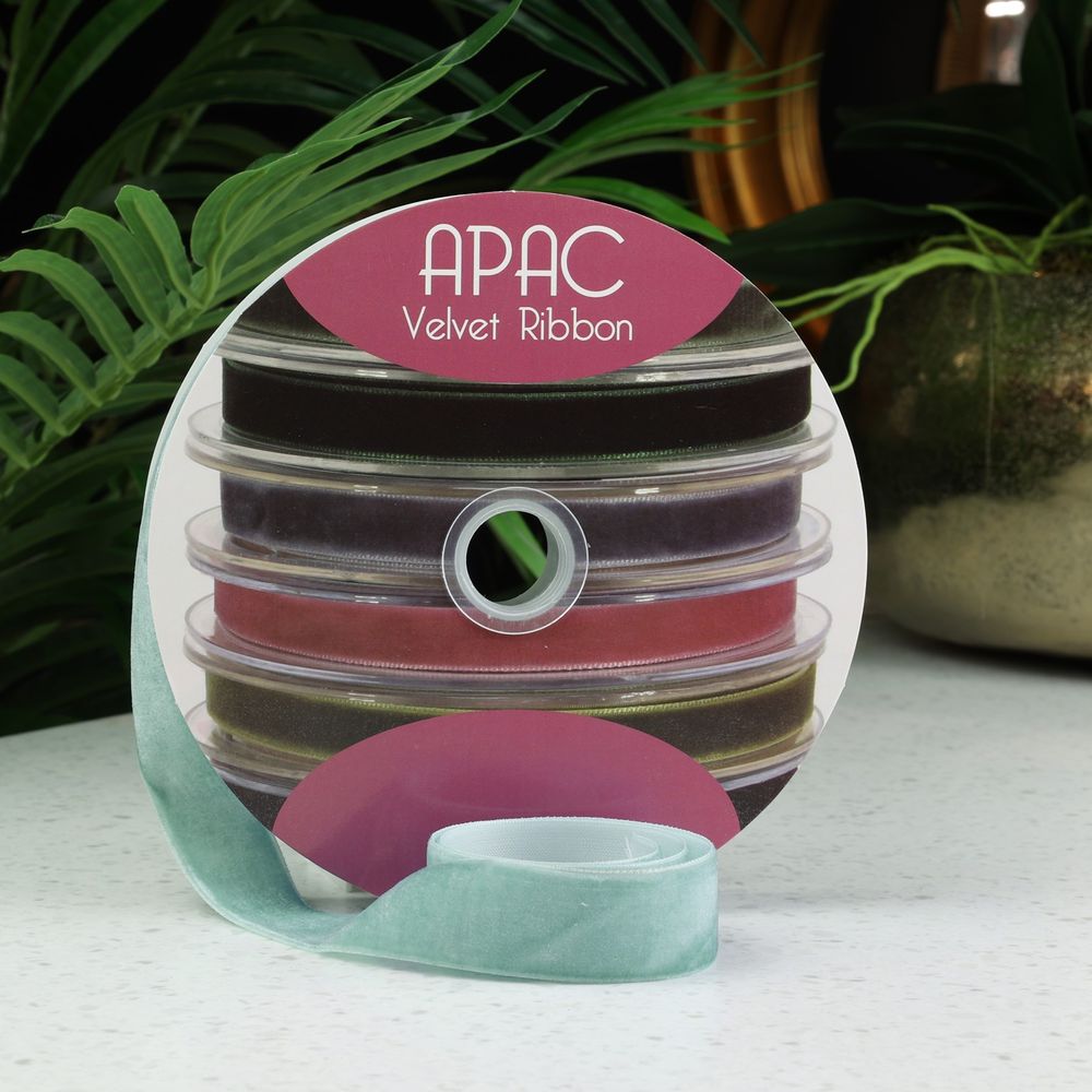 Add a touch of elegance to your crafts and decor with this luxurious Duck Egg Blue Velvet Ribbon.