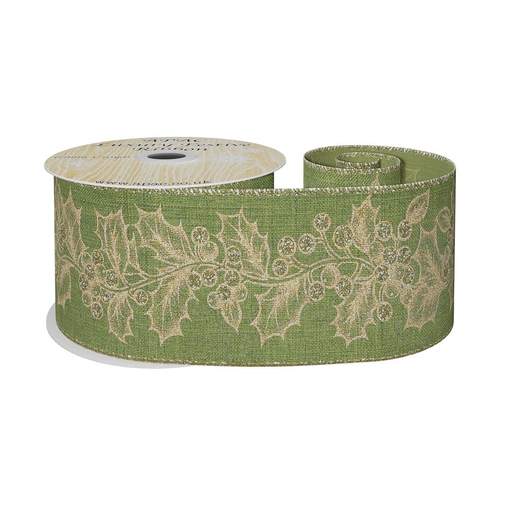 Green with Gold Holly Ribbon (63mm x 10yds) with wired edge, perfect for festive arrangements.