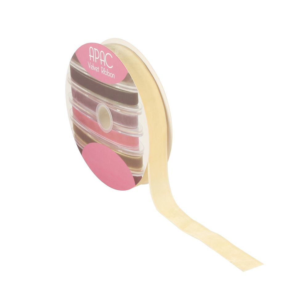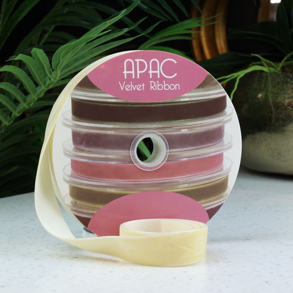 A beautiful velvet ribbon, a soft weave with a mat finish made from nylon or polyester. This versatile product is perfect for trimming gifts, church pews or bouquets.
