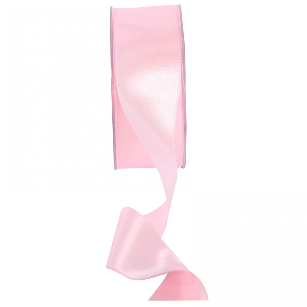 A roll of 38mm light pink satin ribbon, perfect trim for tying around favour boxes, napkins, stationery, gifts or flowers.
