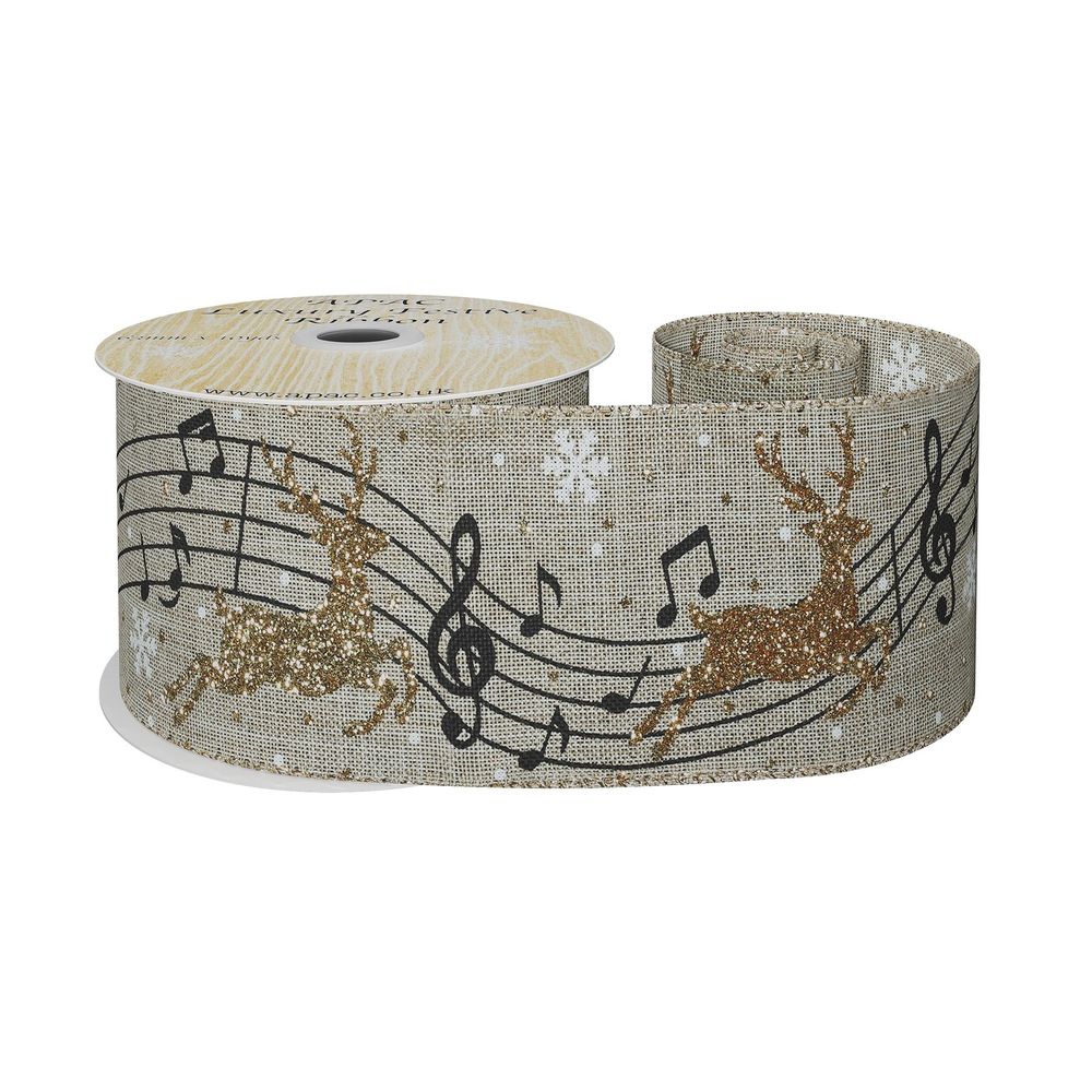 Natural Ribbon With Gold Reindeer and Musical Notes (63mm x 10yd)