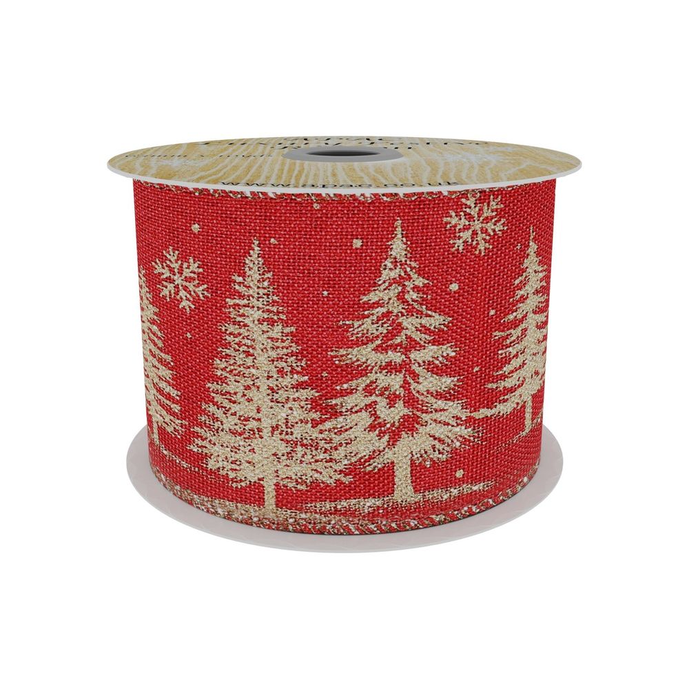 Red Mesh Ribbon with Gold Xmas Tree Print (63mm x 10yd)