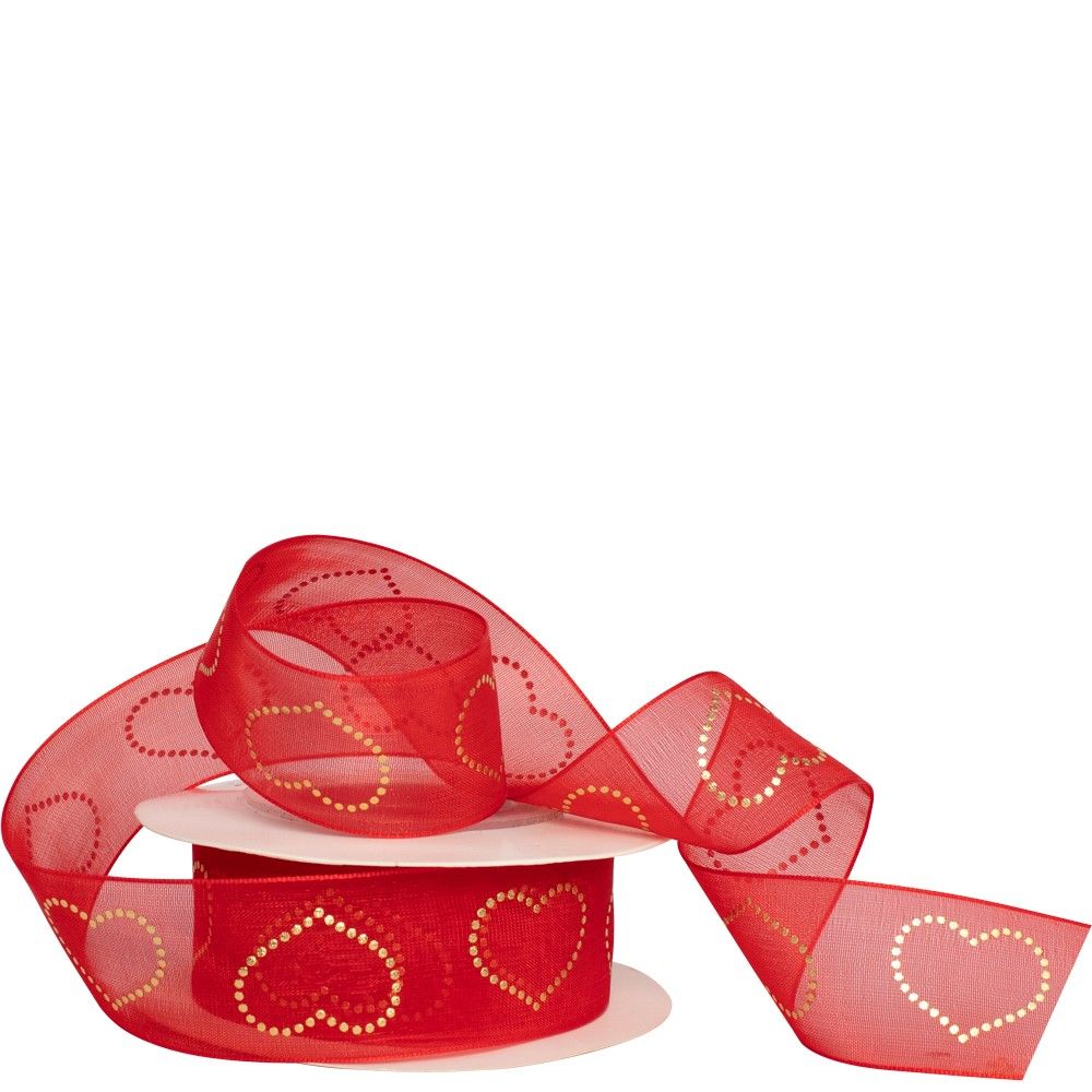 Express your love with our Straight To Your Heart Ribbon (25mm), featuring an endless row of sparkling outlined love hearts in gold on a delicate sheer red organza ribbon.