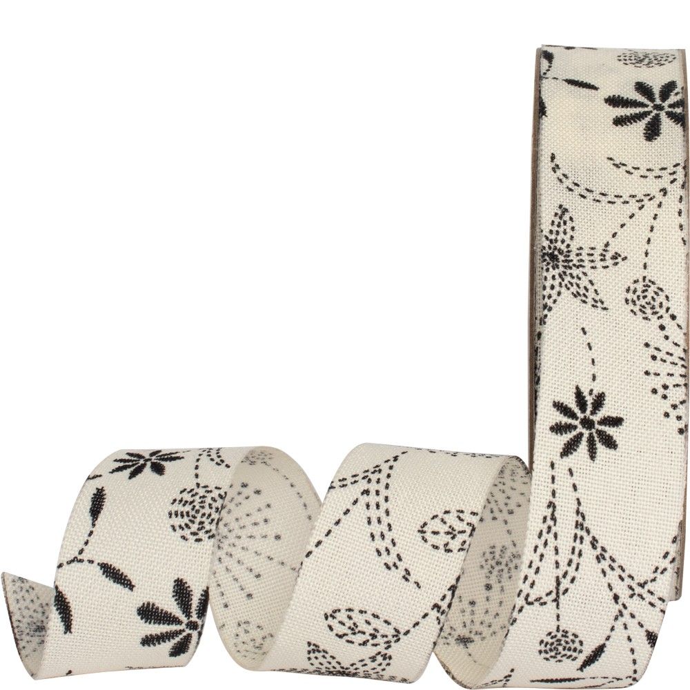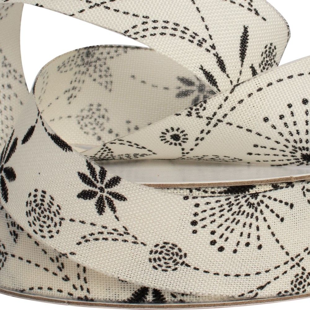This white woven ribbon is decorated with an energetic trail of black flowers in varying pattern styles, creating a bold and dynamic look. Perfect for adding a unique touch to gift wrapping, floral arrangements, craft projects, and home déecor. Its striking design makes it ideal for both modern and vintage-inspired projects.