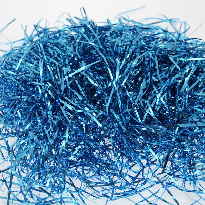 A 25g sized bag of blue luxury metalic shred, ideal for packing out a gift hamper or box.