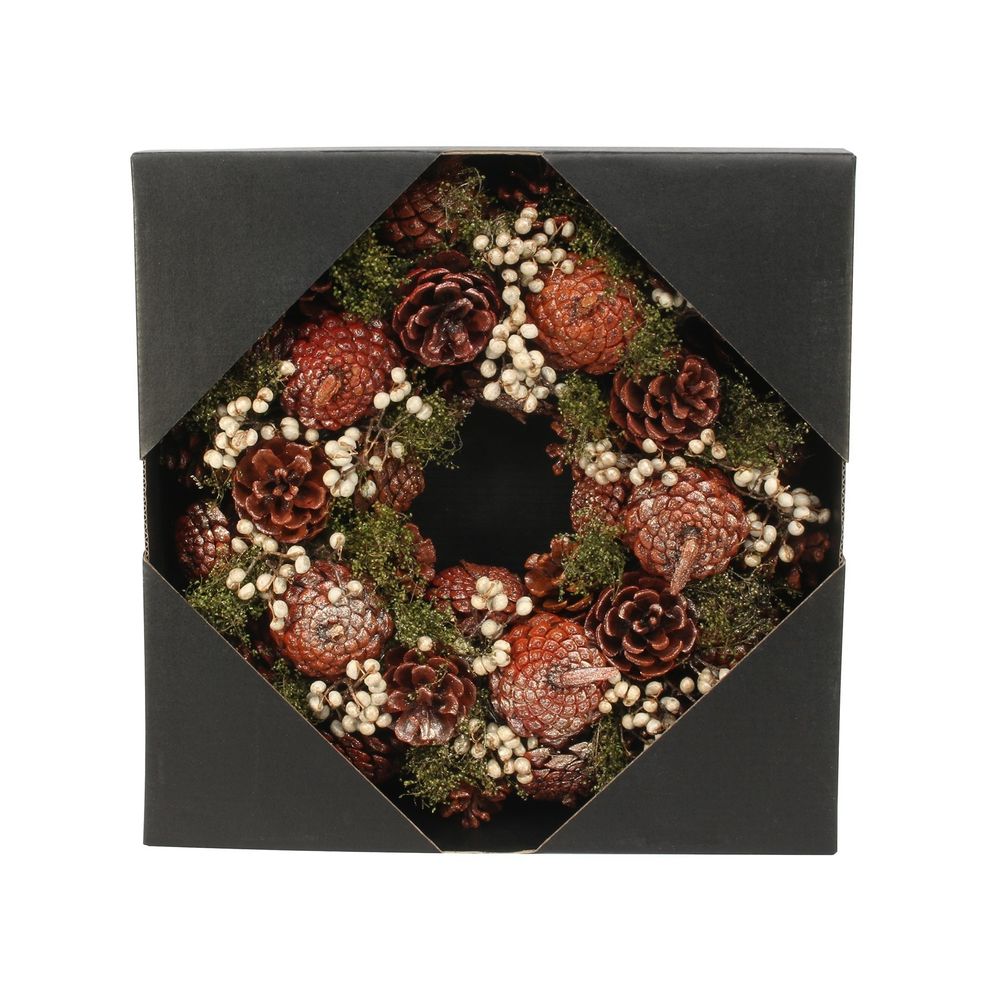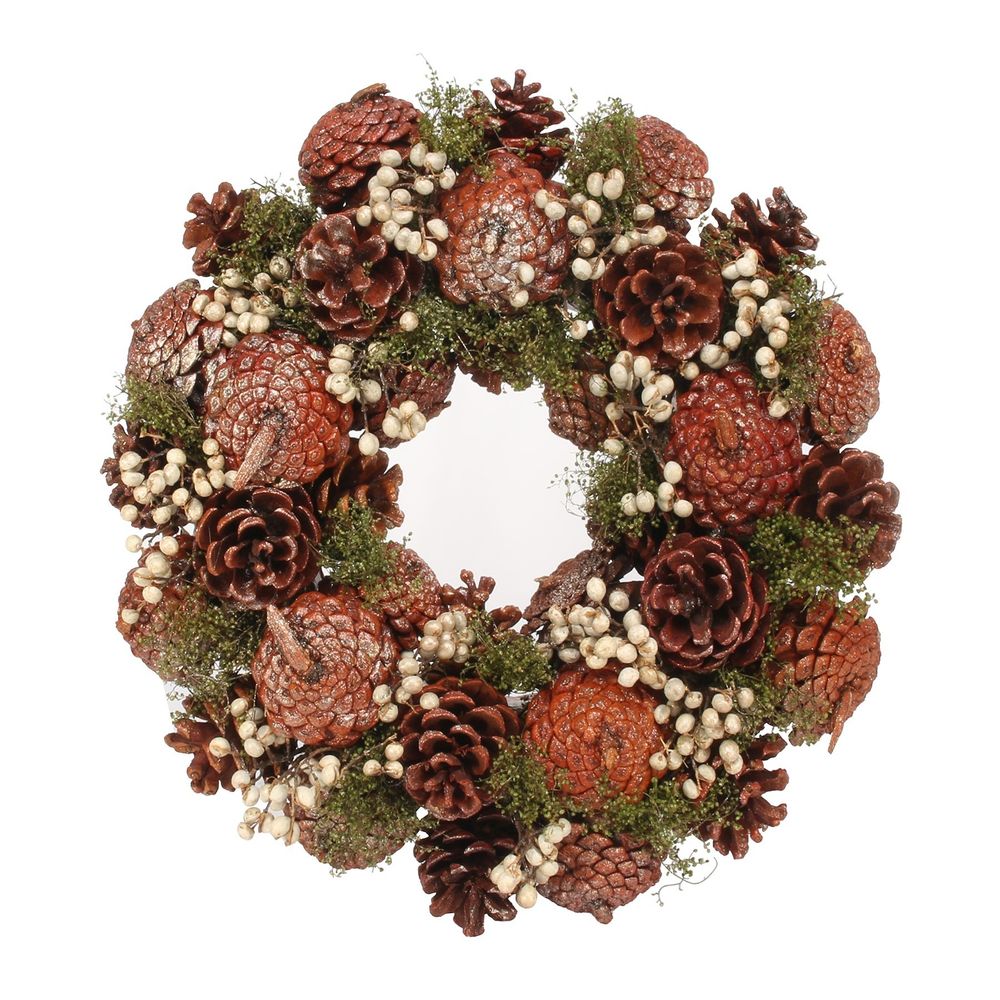 With autumnal-inspired tones from golden-finished pine cones, moss and golden berries, this wreath is designed to take you through the seasons.