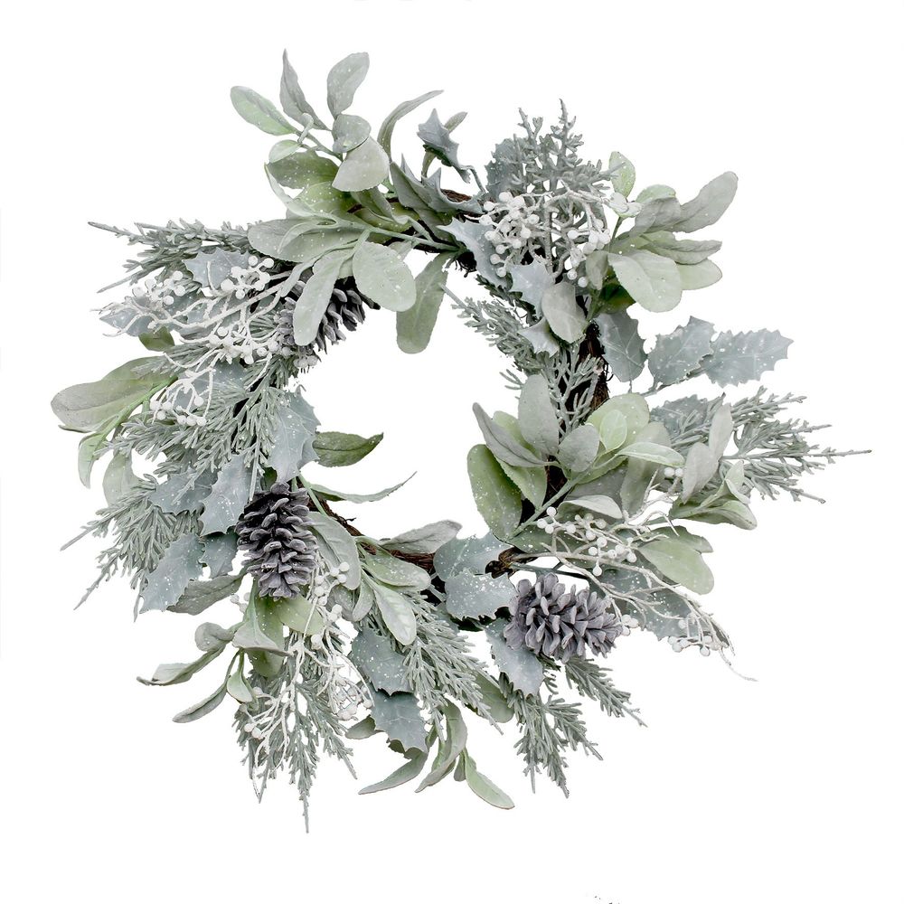 Lambs Ear, Holly Pine Cone & White Berry Flocked Wreath (60cm)