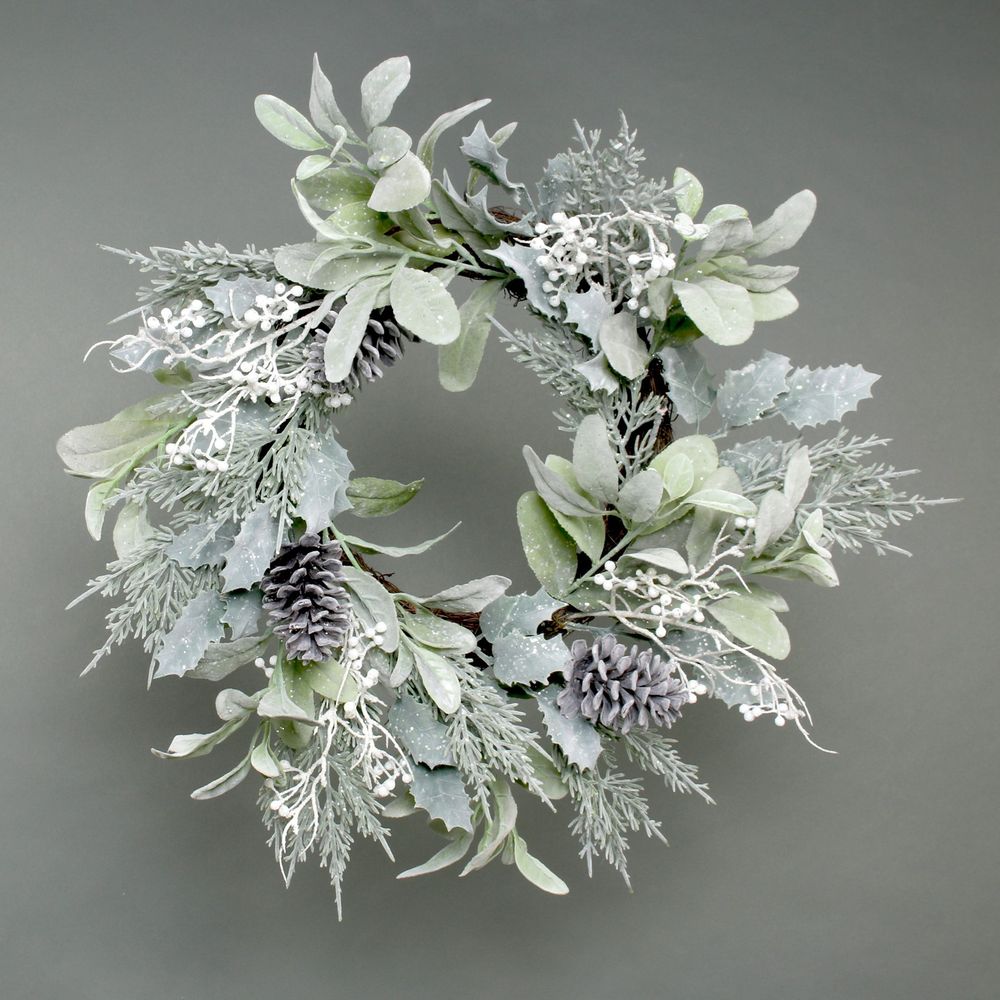 With lamb's ear, holly, pine cones & white berries in a flocked finish, this wreath is designed to have plenty of interest and a realistic style.
