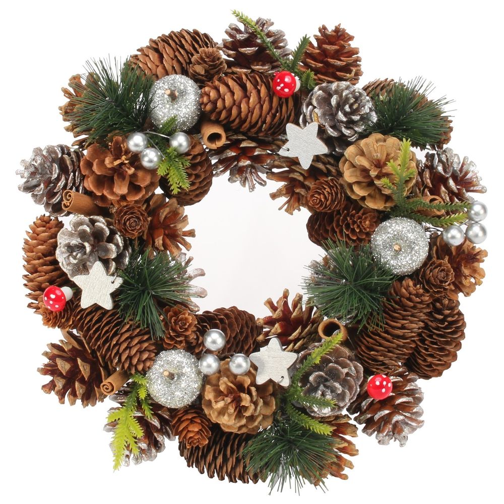 This traditional themed wreath features pine cones interspersed with spruce, wooden stars, toadstools and silver apples.