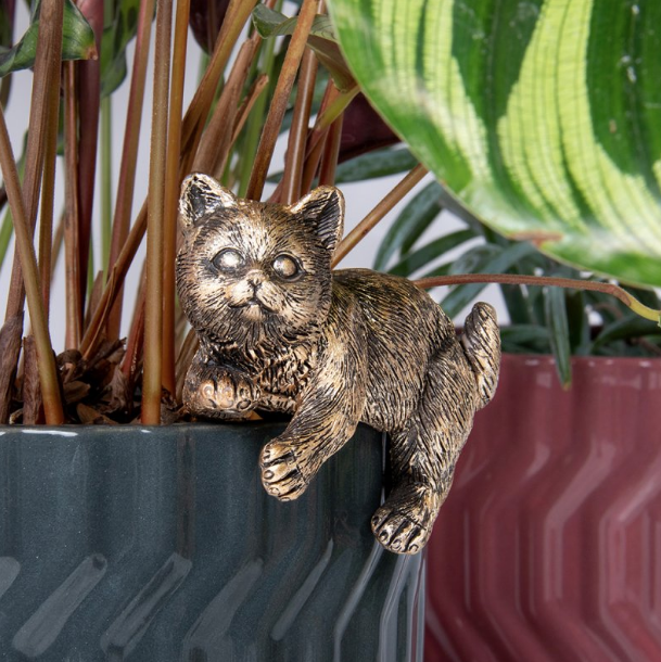 This adorable cat figurine is designed to rest on the edge of your plant pots, bringing a whimsical and charming character to your indoor or outdoor greenery.