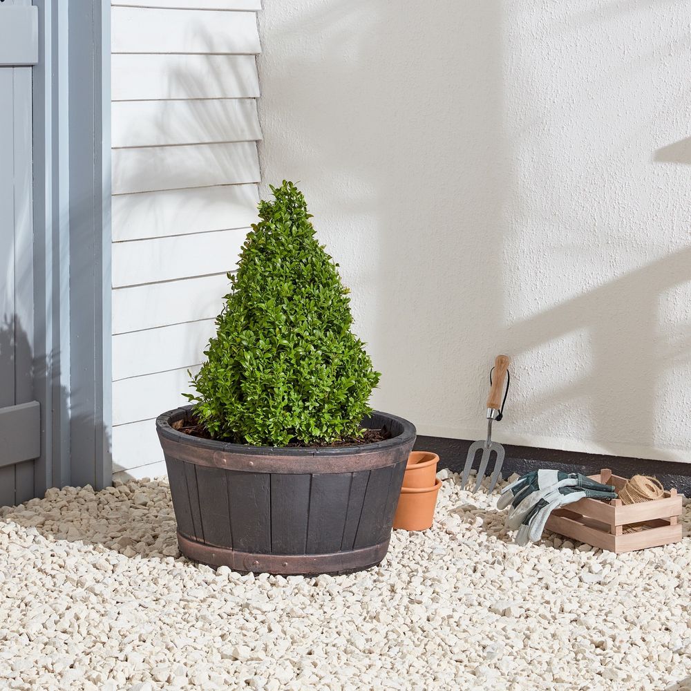 Introducing the Black Oakwood Barrel Planter, the perfect rustic touch for both indoor and outdoor garden spaces. Crafted from high-quality oakwood, this barrel planter brings elegance and charm to any setting. Its sturdy design ensures durability, while the dark black finish enhances its classic appeal. The large capacity allows for ample space to plant herbs, flowers, or small shrubs. Integrated drainage holes promote healthy plant growth, preventing overwatering. Whether placed in a sunny garden spot or as a feature on your patio, this barrel planter provides versatility and style for all your planting needs.