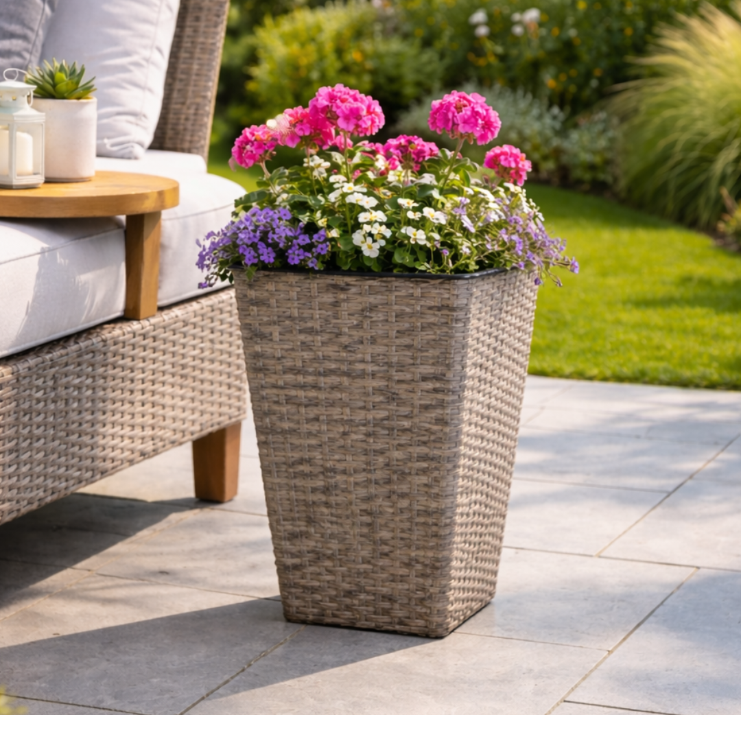 Transform any outdoor or indoor space with the Grey Rattan Effect Tall Planter.