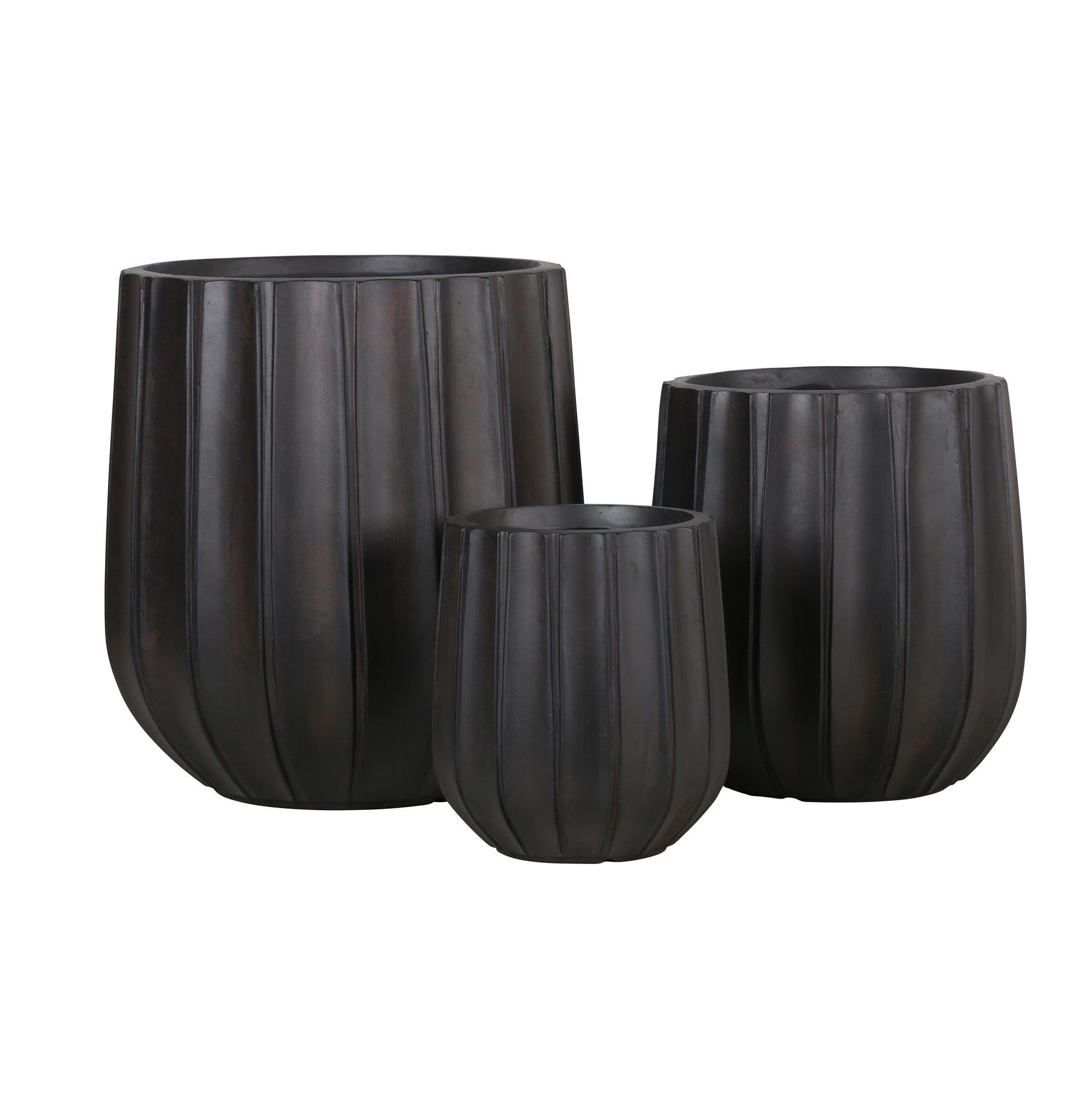 Create a striking outdoor display with this set of 3 Hortus Outdoor Wide Ribbed Black Planters. Expertly crafted, these planters feature a robust design that ensures durability and weather resistance, perfect for enriching your garden or patio. The planters showcase a contemporary wide ribbed texture that adds visual interest and sophistication to your exterior spaces. Their deep black colour provides the perfect contrast to vibrant foliage and blooms, accentuating your plant displays beautifully. With varied sizes, these planters offer versatile staging options, allowing you to highlight plants of different heights and create an exquisite layered effect. Ideal for both beginners and seasoned gardeners, this set adapts easily into any outdoor decor scheme while supporting a lush, thriving garden environment.