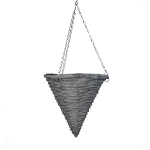 A grey wash willow hanging basket to suit any garden or front porch. The hanging basket has a unique downward cone style.