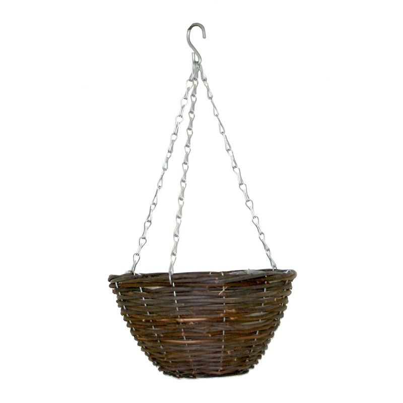 A rattan 10 inch round hanging basket.