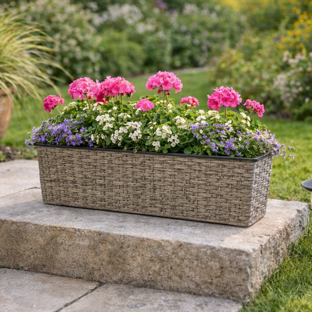 Elevate your gardening space with the Grey Rattan Effect Trough Planter.