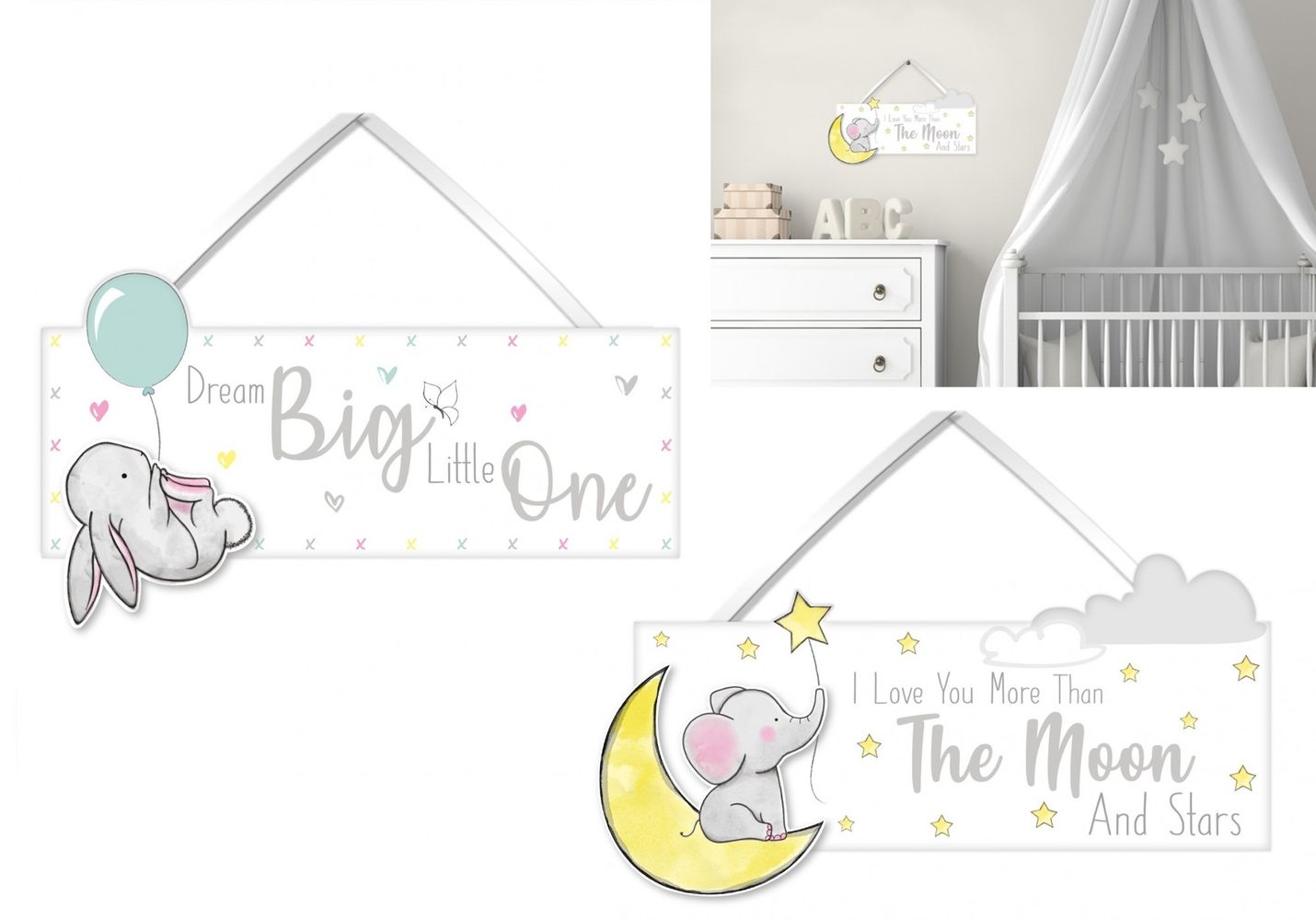 This baby sign is the perfect addition to any nursery or playroom, made from wood and featuring two baby designs it can be easily hung using the white ribbon.