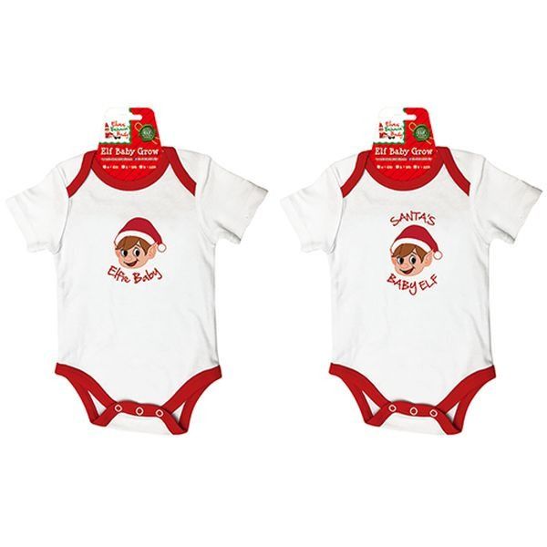 Barcode (EAN): 5037241262442 Single. 'Elf' baby grow. With embroidery. 2 assorted designs: Elfie Baby and Santa's Baby Elf. 3 assorted sizes:0-6, 6-9 and 9-12 months