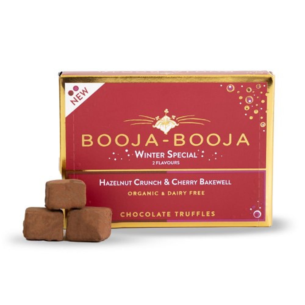 Indulge in Booja-Booja's Winter Special Hazelnut Crunch & Cherry Bakewell Truffles, a delightful treat that captures the essence of the festive season.