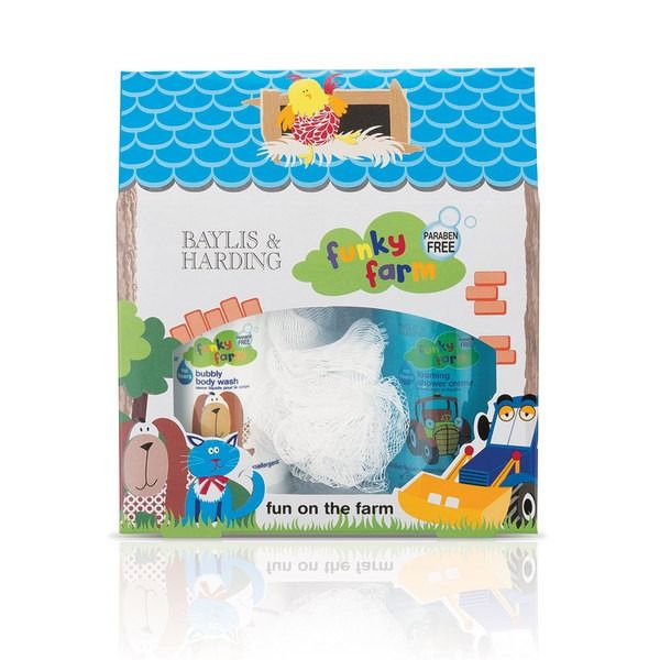 Baylis & Harding Funky Farm 3 Pce Boys Toiletries Set. Includes 250ml Shower Cr�me, 250ml Body Wash and Nylon Body Polisher
