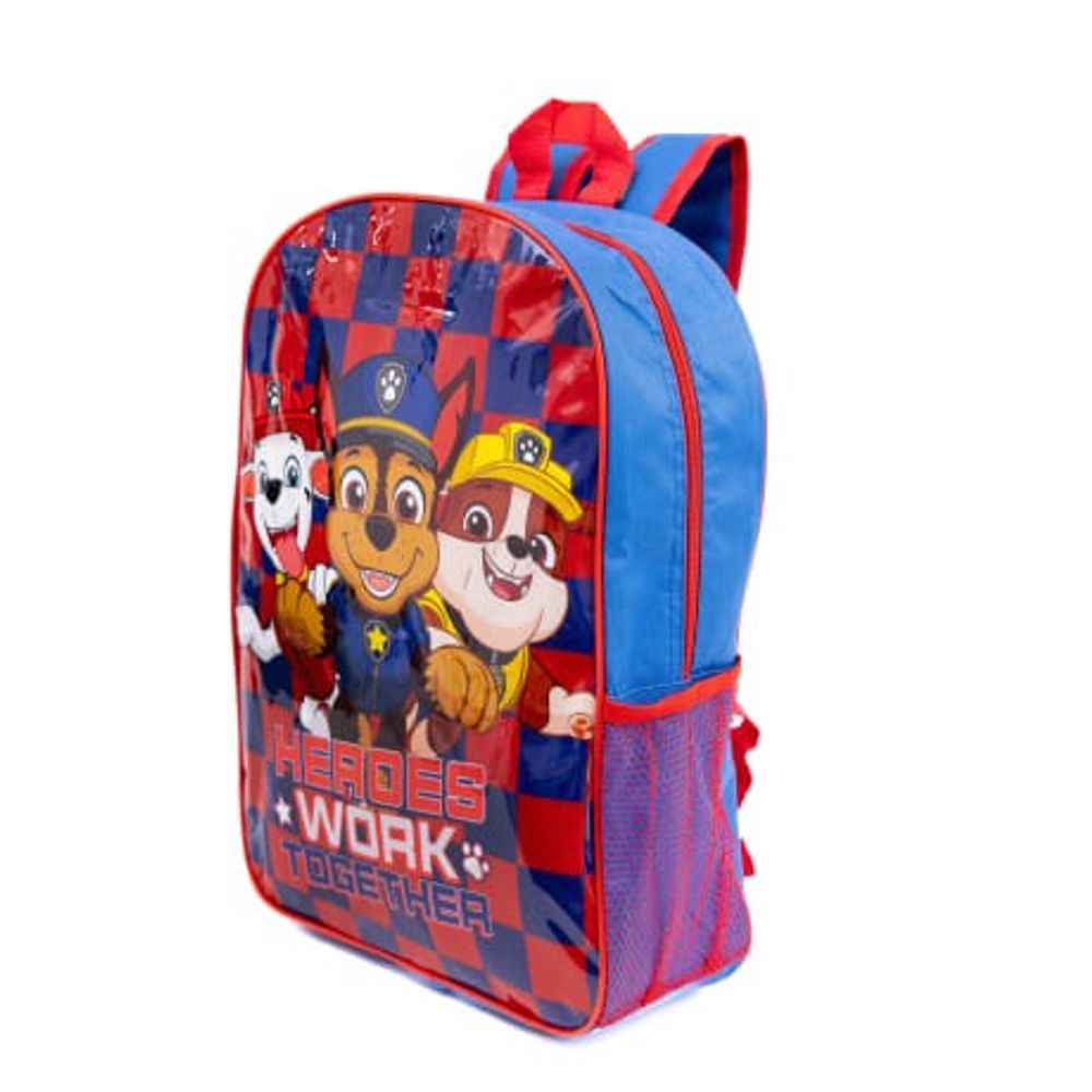 This Paw Patrol themed junior backpack comes with adjustable padded shoulder strap, carry handle and side mesh pocket.