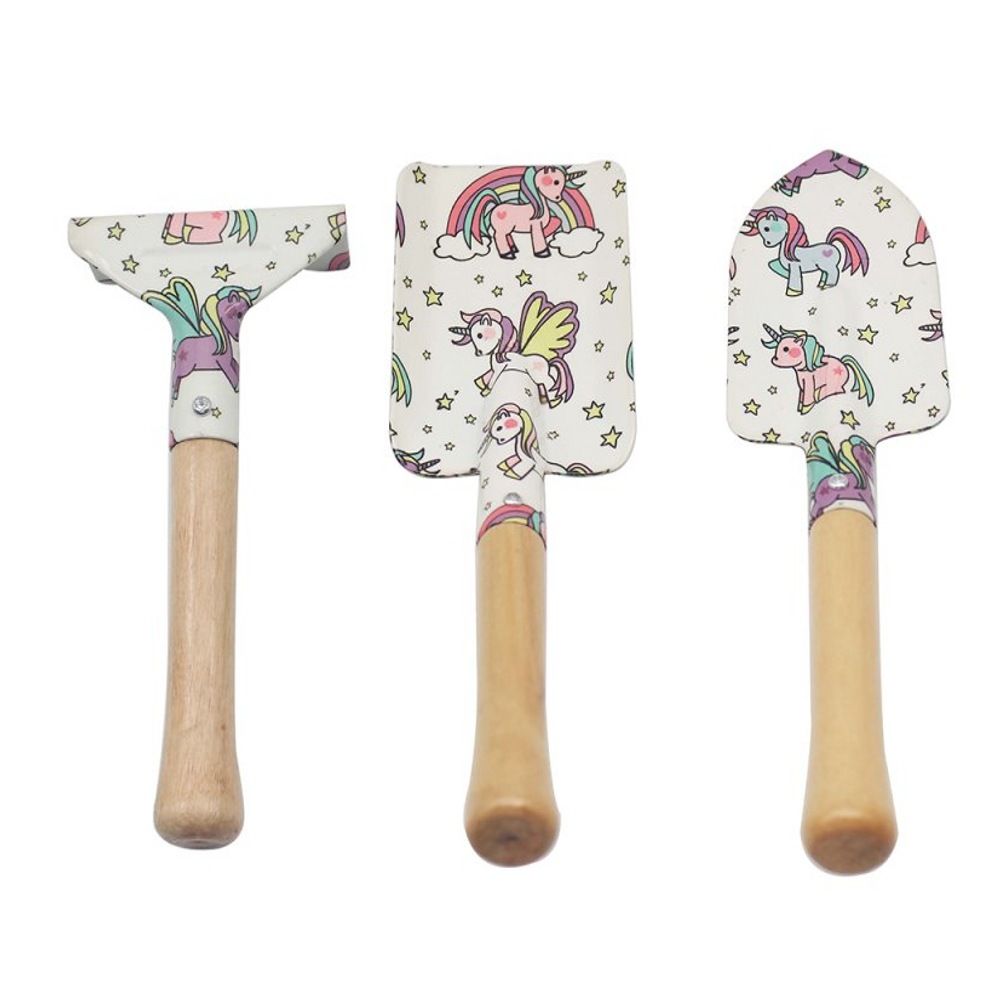 This 3-piece set includes a hand trowel, fork, and rake, each adorned with whimsical unicorn illustrations, bringing a touch of fantasy to outdoor fun.