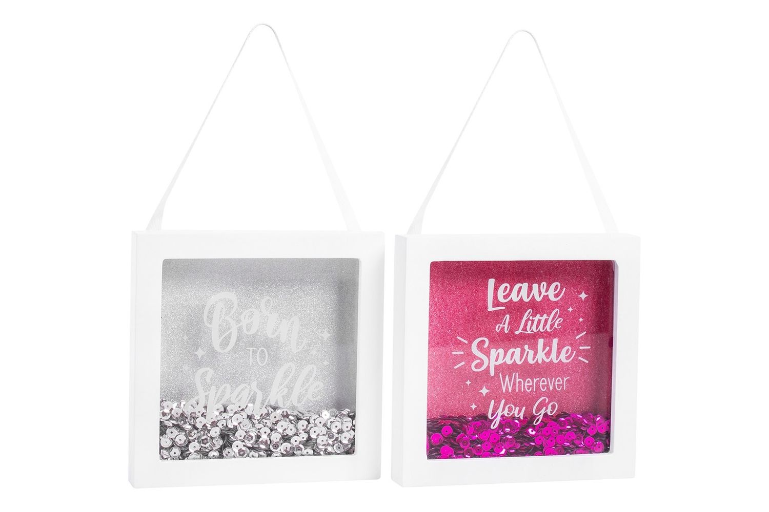 Made from wood with a glass front and ribbon hanging loop. These boxes features a glitter backing with a vinyl quote on the front of wither 'Leave a little sparkle wherever you go' or 'Born to Sparkle.' Each design is filled with matching sequins.