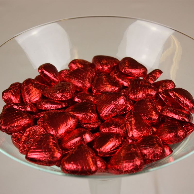 A Pack of (1kg) of red foil wrapped chocolate hearts.