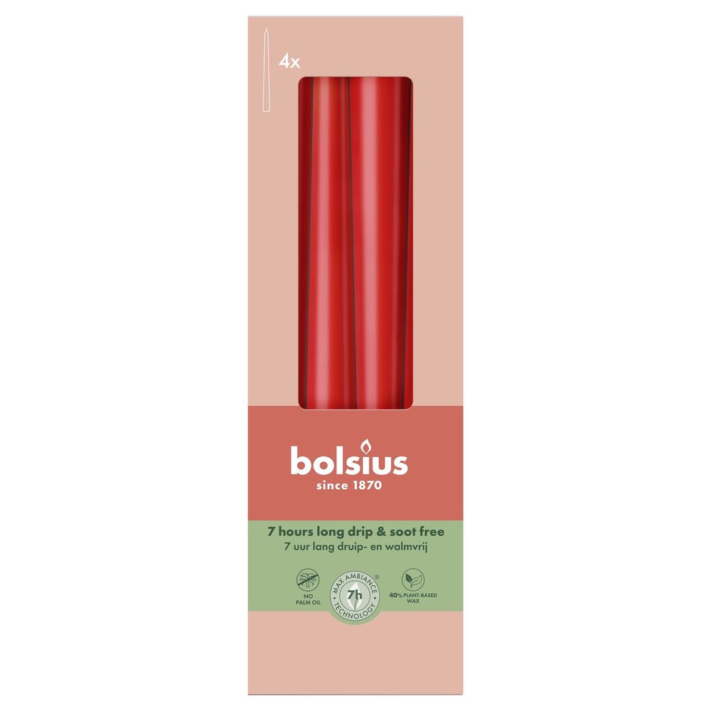 Illuminate your space with the Bolsius Delicate Red Essentials Tapered Candles, perfect for creating an elegant ambience at any event.