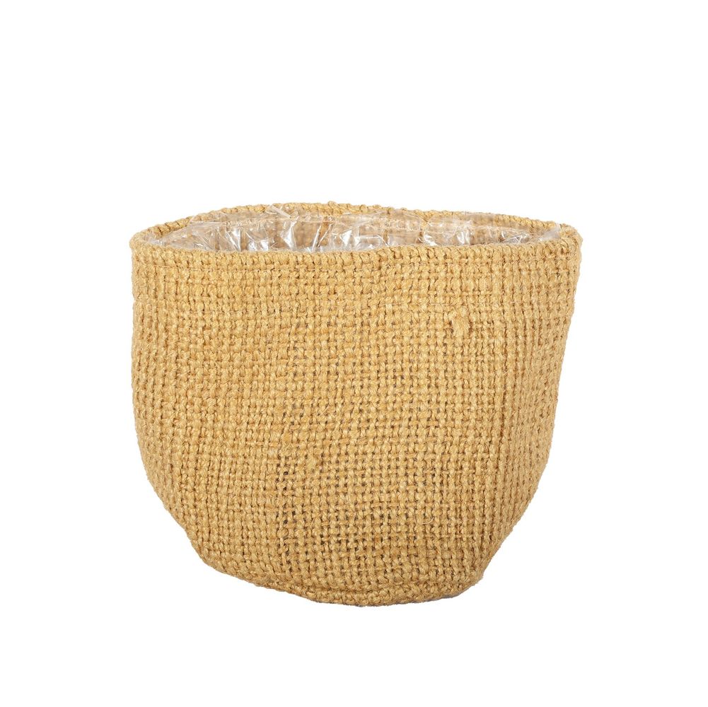 Made from natural woven jute and fitted with a protective plastic liner, it blends rustic charm with functional design. Whether you're a florist crafting small arrangements or decorating shelves, desktops, or window ledges, this compact basket adds a warm, organic touch wherever it’s placed.