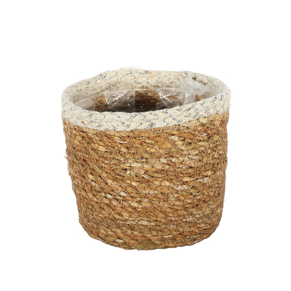 The 12cm Natural & Silver Hogla Basket with Liner combines the rugged texture of natural hogla fibres with subtle silver accents, creating a delicate yet rustic look.