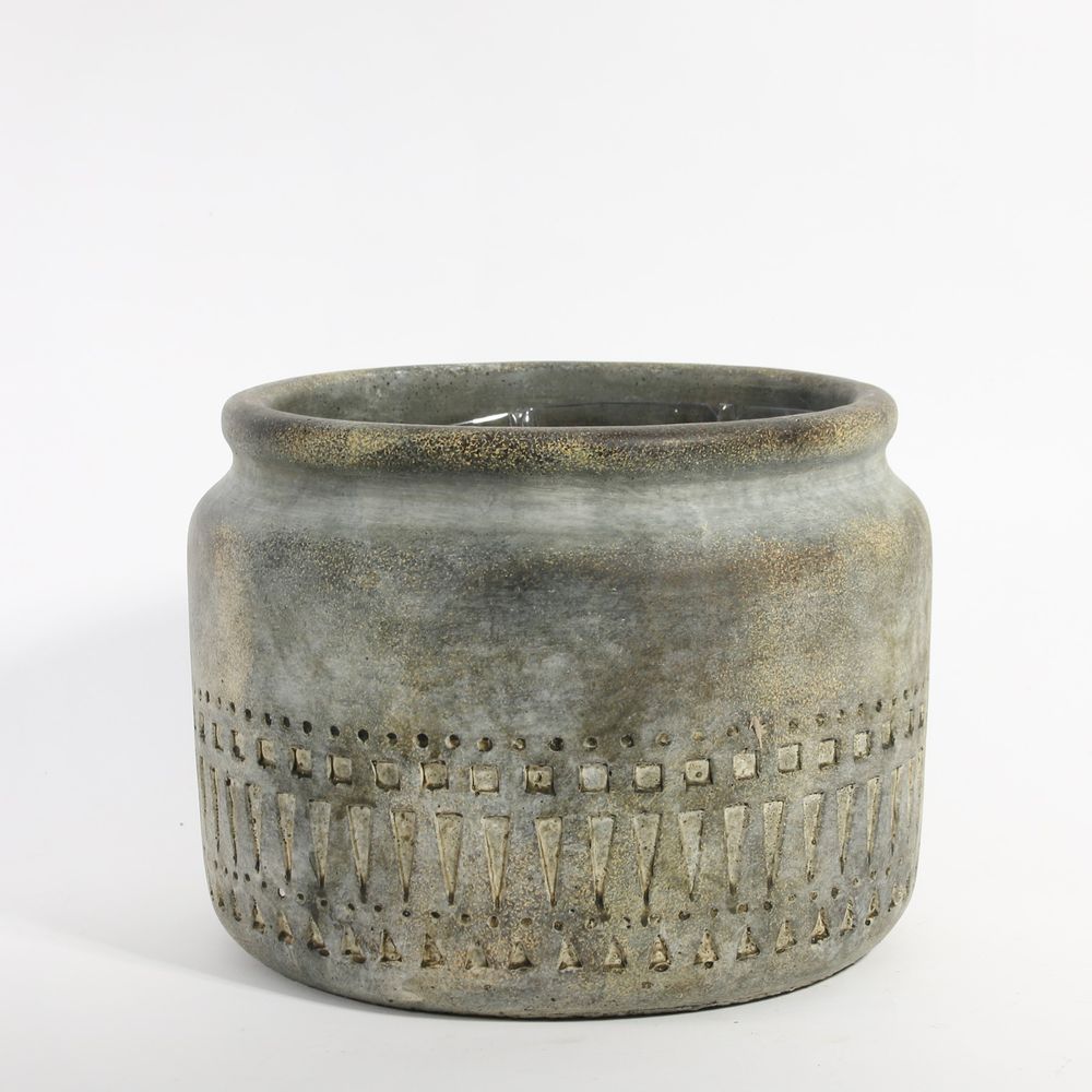 Crafted from muted matt green and grey wash toned cement this planter features a simple yet eye catching tribal inspired design.
