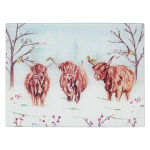 Featuring a stunning watercolor design of three Highland cows in a snowy countryside scene, this board doubles as both a practical kitchen accessory and a beautiful decorative piece.
