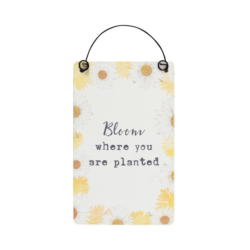 Sweet mini hanging sentiment sign featuring a pretty daisy design and the quote 'Bloom where you are planted'. A thoughtful little gift to make someone's day.