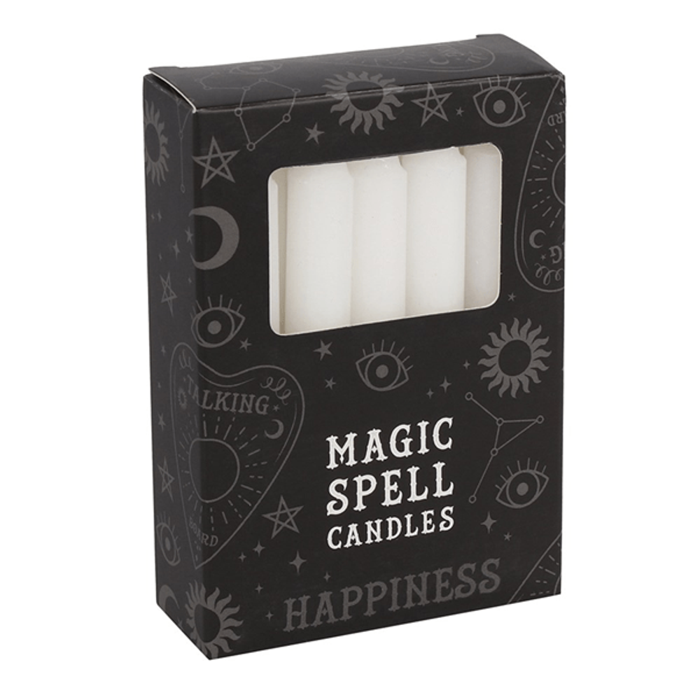 Pack of 12 white spell candles for use with rituals to attract happiness, new beginnings and spiritual growth. Candle magic is one of the simplest forms of spell casting in which the caster decides on a goal, visualizes the end result and focuses intent or will to manifest that result