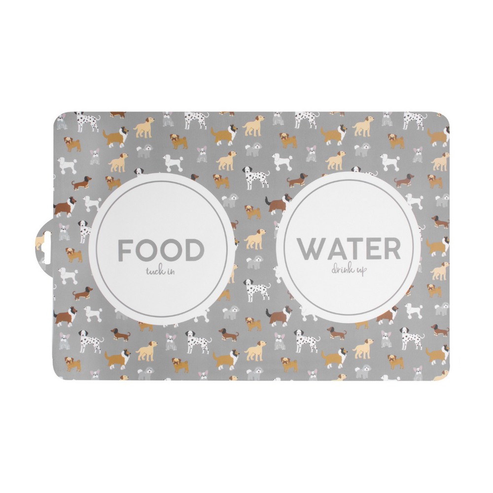 This food and water pet bowl mat is an essential item for any pet owner, helping to protect floors and avoid spills. Machine washable and PVC backing.