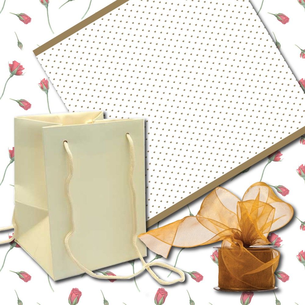 This beautifully curated set includes Ivory Hand Tie Bags, Gold Hearts Frosted Cellophane and Gold Organza Ribbons.