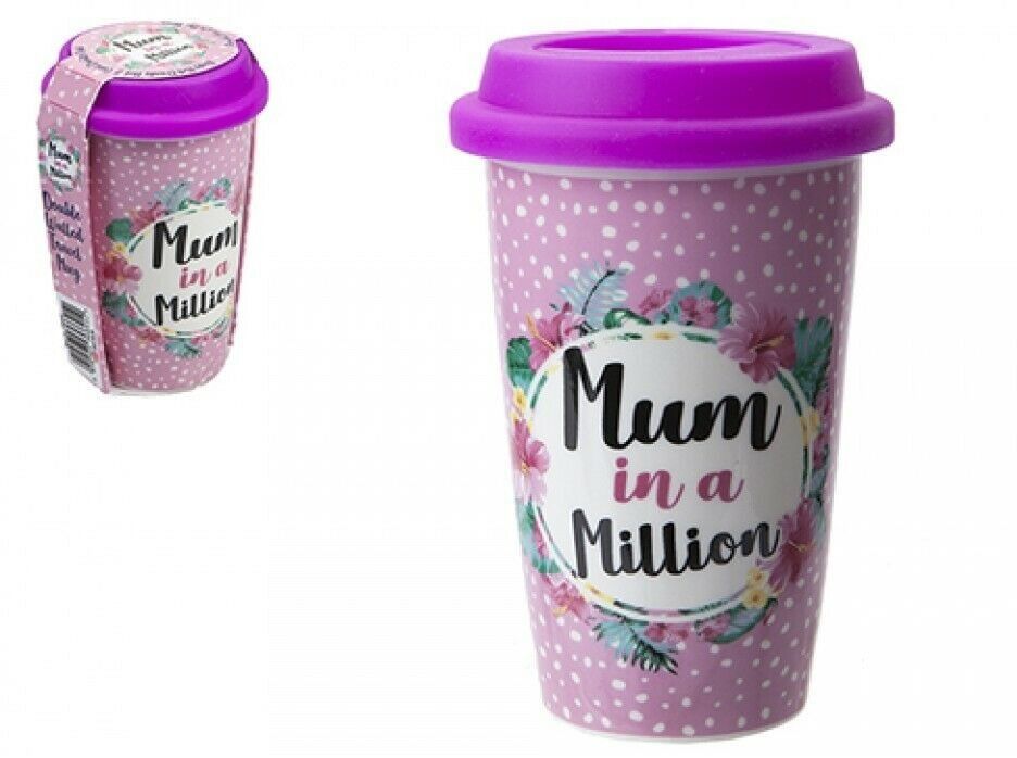 320ml Double wall porcelain cup with lid with Mum in a Million design, perfect for a Mother's Day gift