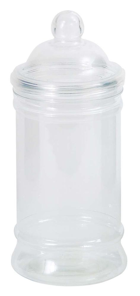 A clear plastic candy jar with a old fashioned victorian style